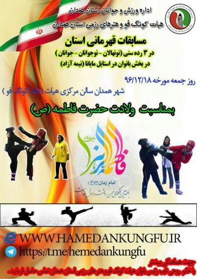 به گزارش پایگاه خبری همدان ورزش،مسابقات قهرمانی استان هیات کونگ فو و هنرهای رزمی استان همدان در بخش بانوان بمناسبت ولادت حضرت فاطمه(س)برگزار می شود و مسابقات در سه رده سنی نونهالان نوجوانان و جوانان است .